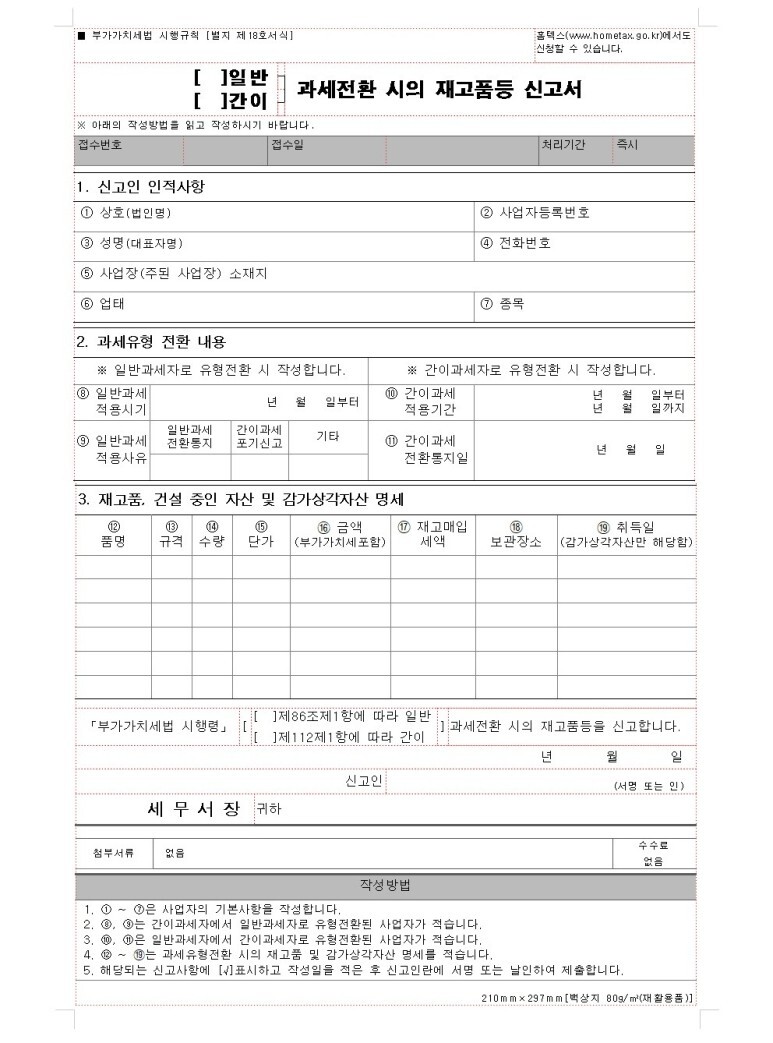 ● 재고매입세액을 공제받기 위해서는 과세유형 전환시 "과세전환시의 재고품 등 신고서"를 작성하셔야 합니다.