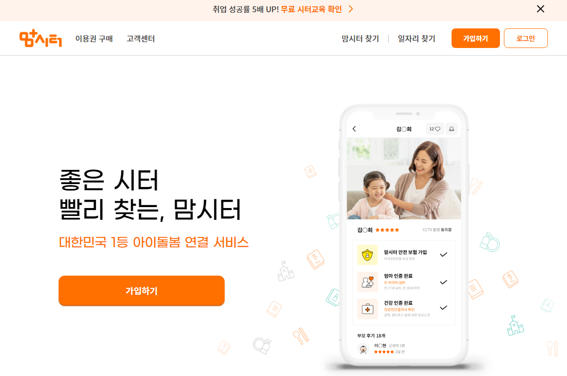 맘시터는 말그대로 엄마의 입장에서 아이에게 돌봄서비스를 행하는 것입니다. 도움이 필요한 바쁜 부모님들이 믿을 수 있는 아이돌보미를 쉽고 빠르게 찾을 수 있는 서비스입니다.