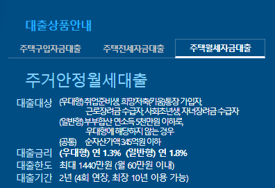 연 1.3~1.8% 수준의 시중금리보다 비교적 낮은 금리로 월세 자금을 마련할 수 있는 대출입니다.